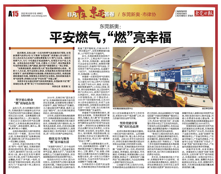 “發展清潔能源,造福東莞人民”是東莞新奧的初心使命。黨的十八大以來,堅守這份初心使命,東莞新奧在東莞市委市政府的領導下,始終緊跟城市發展戰略,積極承擔社會責任,用清潔能源助推城市發展,用數智化手段筑牢安全底線,用優質服務提升用氣體驗等,持續助力打造“平安東莞”“幸福之城”。