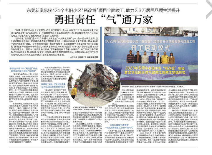 老舊小區(qū)“瓶改管”是2023年東莞市人民政府“十大民生實事”之一,是一項由政府主導,旨在增進居民生活福祉、促進城市高質(zhì)量發(fā)展的民生工程,計劃2023年內(nèi)為全市老舊小區(qū)共4.8萬戶進行“瓶改管”改造。在市城管局等部門的統(tǒng)籌指揮下,東莞新奧燃氣有限公司(下稱“東莞新奧”)積極履行城燃企業(yè)社會責任,主動承接全市近70%的“瓶改管”任務,124個小區(qū)共計3.3萬戶的改造工作。在近9個月的改造過程中,東莞新奧克服工期緊、協(xié)調(diào)面廣、施工條件復雜等難題,全力以赴搶工期、抓質(zhì)量、保安全、提服務,最終圓滿完成任務目標,如期兌現(xiàn)向政府和廣大市民的承諾,助力居民品質(zhì)生活提升,助推東莞民生實事落地。