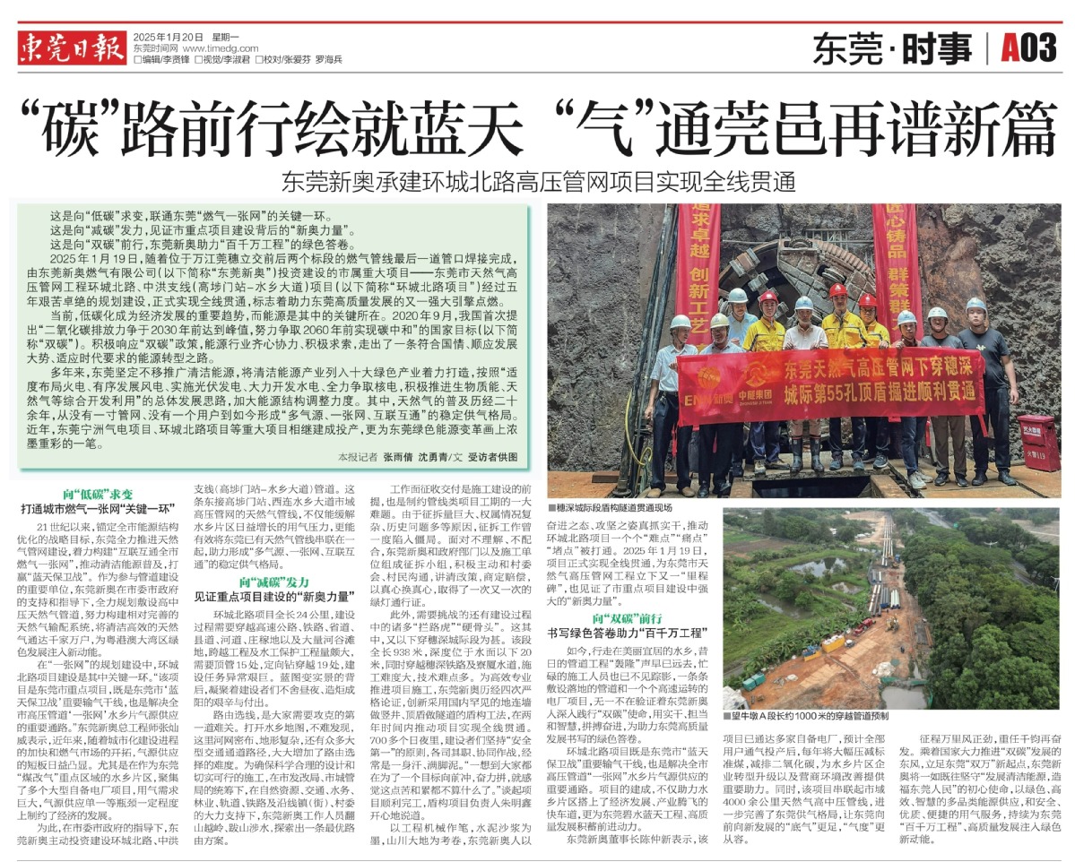 2025年1月19日,隨著位于萬江莞穗立交前后兩個標段的燃氣管線最后一道管口焊接完成,由東莞新奧燃氣有限公司(以下簡稱“東莞新奧”)投資建設的市屬重大項目——東莞市天然氣高壓管網工程環城北路、中洪支線(高埗門站-水鄉大道)項目(以下簡稱“環城北路項目”)經過五年艱苦卓絕的規劃建設,正式實現全線貫通,標志著助力東莞高質量發展的又一強大引擎點燃。