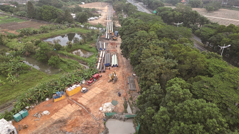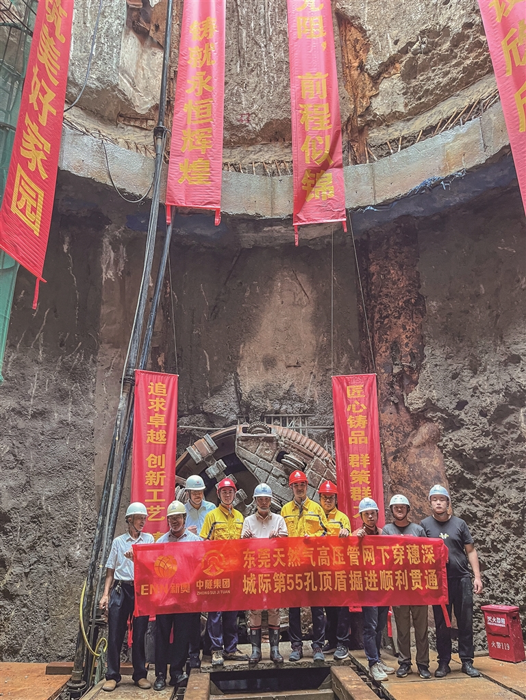 此外,需要挑戰的還有建設過程中的諸多“攔路虎”“硬骨頭”。這其中,又以下穿穗深城際段為甚。該段全長938米,深度位于水面以下20米,同時穿越穗深鐵路及寮廈水道,施工難度大,技術難點多。為高效專業推進項目施工,東莞新奧歷經四次嚴格論證,創新采用國內罕見的地連墻做豎井、頂盾做隧道的盾構工法,在兩年時間內推動項目實現全線貫通。700多個日夜里,建設者們堅持“安全第一”的原則,各司其職、協同作戰,經常是一身汗、滿腳泥。“一想到大家都在為了一個目標向前沖,奮力拼,就感覺這點苦和累都不算什么了。”談起項目順利完工,盾構項目負責人朱明鑫開心地說道。
