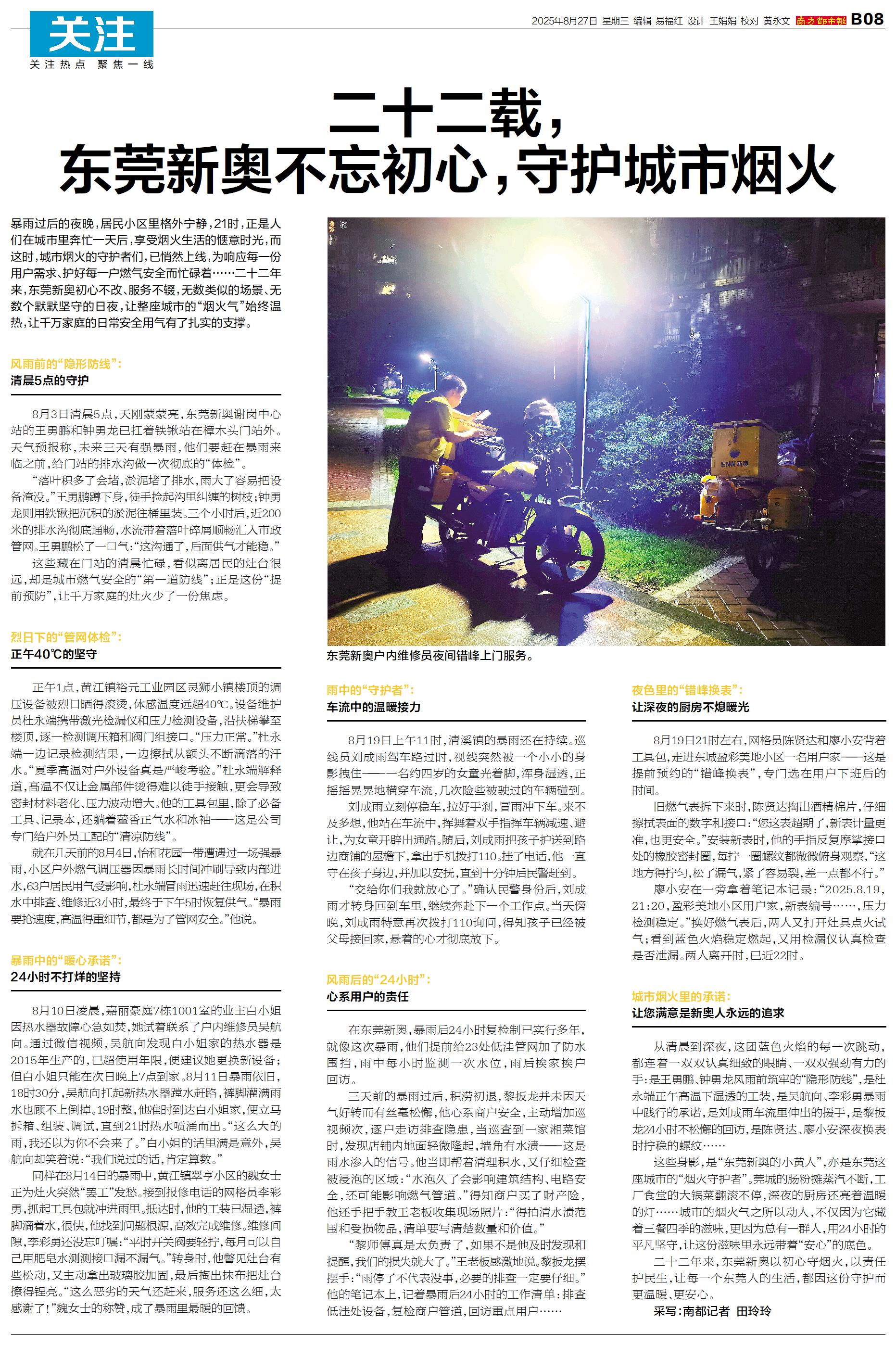 從清晨到深夜,這團藍色火焰的每一次跳動,都連著一雙雙認真細致的眼睛、一雙雙強勁有力的手:是王勇鵬、鐘勇龍風雨前筑牢的“隱形防線”,是杜永端正午高溫下濕透的工裝,是吳航向、李彩勇暴雨中踐行的承諾,是劉成雨車流里伸出的援手,是黎扳龍24小時不松懈的回訪,是陳賢達、廖小安深夜換表時擰穩的螺紋……